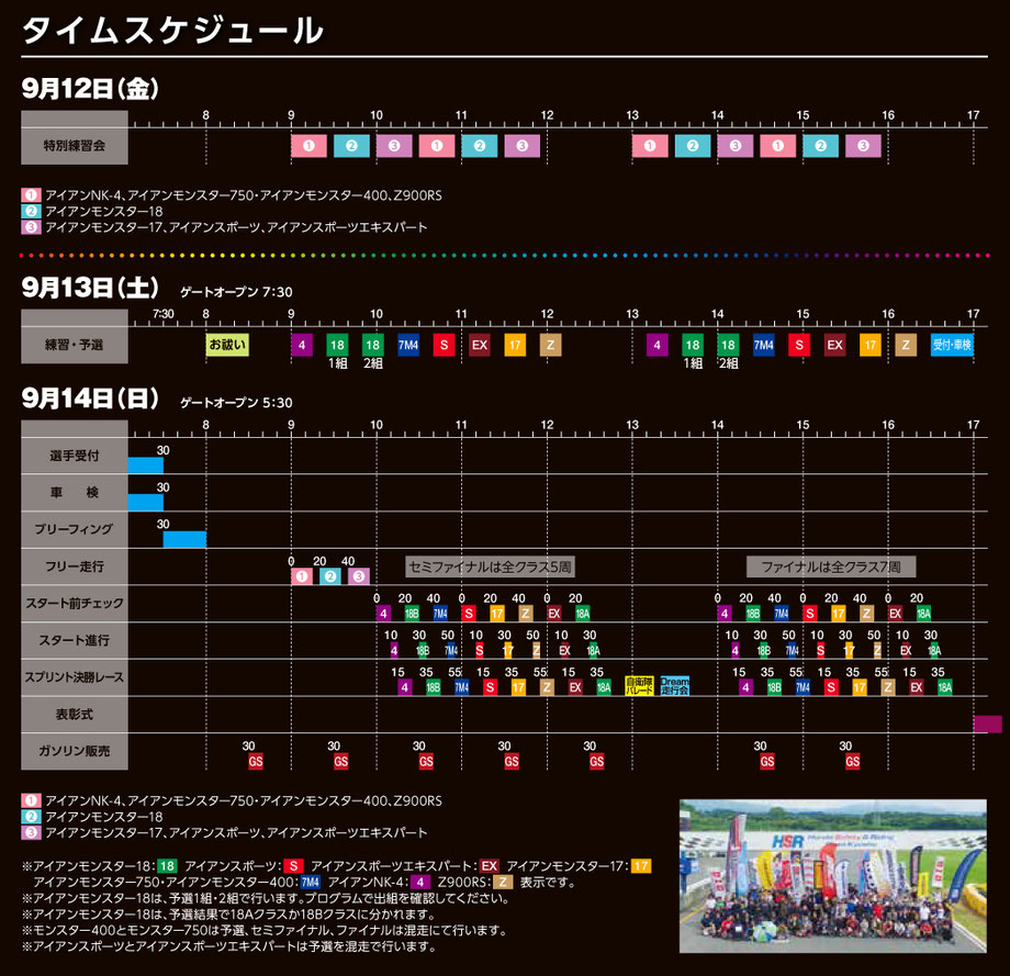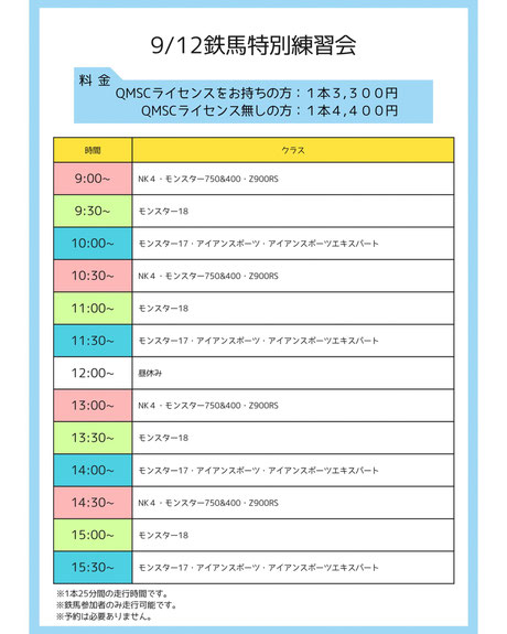 決戦の日前日の9月12日(金)は大会エントラント向けの特別スポーツ走行を行います。走行料金、タイムスケジュールはリストを参照ください。保険料は鉄馬会員費に含まれますので必要ありません。